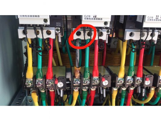 故障情況:三相電機缺相,損壞電容接觸器未按要求壓接銅鼻子