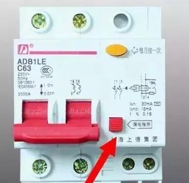 看一下紅箭頭對應(yīng)的位置:漏電指示,如果漏電跳閘,這個(gè)地方正常情況下會凸出來,高于平面,必須按下去才能再次合閘。