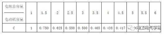 其中IQ為電機(jī)啟動電流;In為電機(jī)的額定電流;C為系數(shù),電源總?cè)萘颗c電機(jī)總?cè)萘恐取V狄娤卤恚?/p>