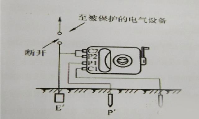 1.在測量接地電阻時將C2、P2兩個接線柱用鍍鉻銅板短接,并接在隨儀表配來的5m長純銅導線,導線的另一端接在待測的接地體測試點上(E’);