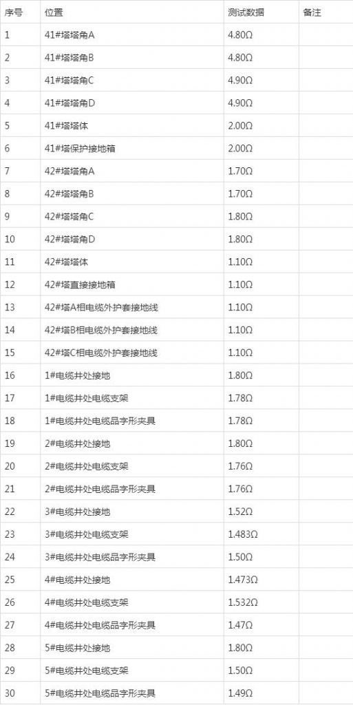 1)、對(duì)41#鐵塔、42#鐵塔、電纜溝道接地電阻進(jìn)行測(cè)試,測(cè)試結(jié)果<10Ω,符合要求。測(cè)試數(shù)據(jù)為: