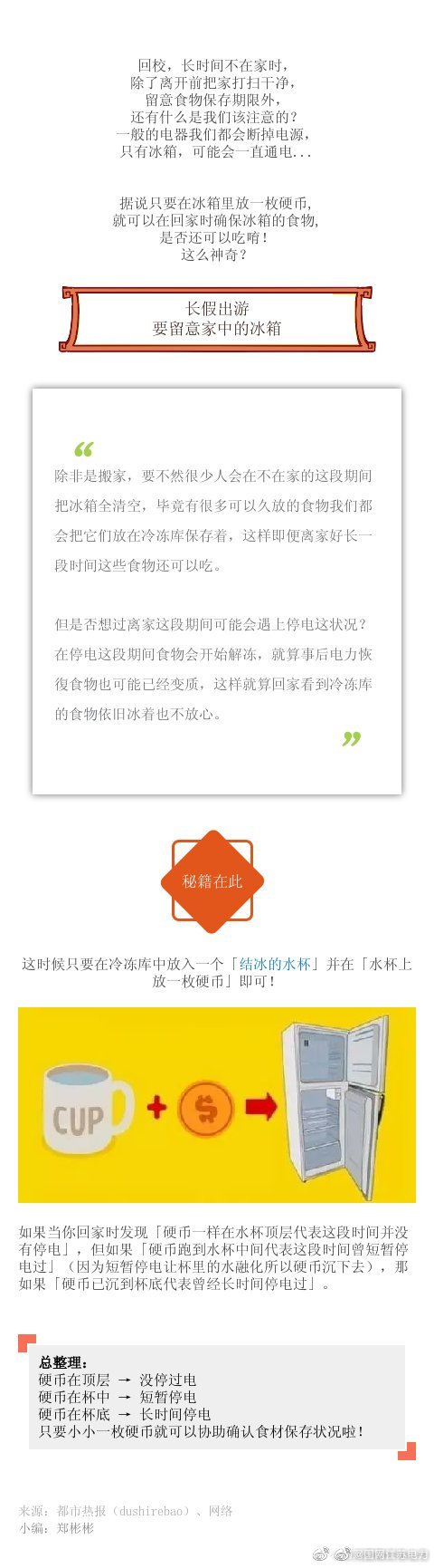 返校常駐,家里沒人,冰箱上記得要放一個(gè)硬幣!這是要干嘛?辟邪?導(dǎo)電?NO!NO!NO!這時(shí)候只要在冷凍庫中放入一個(gè)「結(jié)冰的水杯」并在「水杯上放一枚硬幣」即可!這樣做起到了什么作用呢?