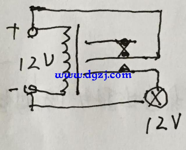 4、有種繼電器是12V直流供線圈作電源,但控制的用電器也是12V同一個(gè)電源,那就可從線圈一端的正極上與另一端開關(guān)點(diǎn)相連,當(dāng)吸合時(shí),直接起到12V開關(guān)作用,閉合后另一觸點(diǎn)也測(cè)到電壓。