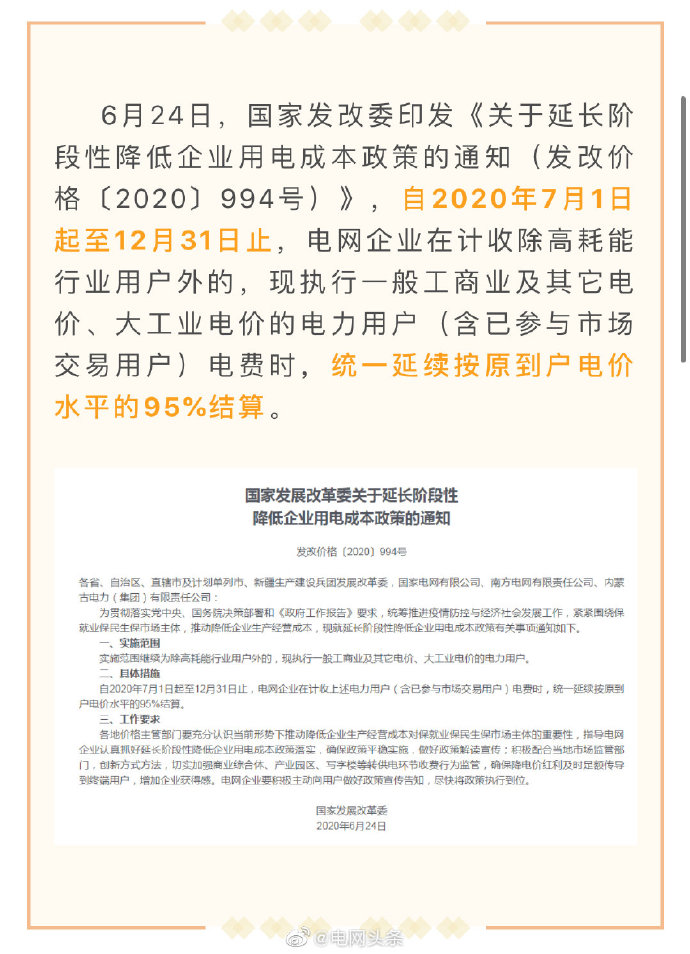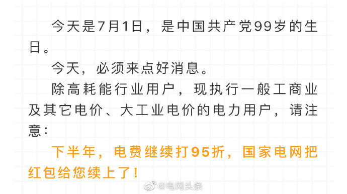 除高耗能行業(yè)用戶,現(xiàn)執(zhí)行一般工商業(yè)及其它電價(jià)、大工業(yè)電價(jià)的電力用戶,請(qǐng)注意:下半年,電費(fèi)繼續(xù)打95折,國家電網(wǎng)把紅包給您續(xù)上了!