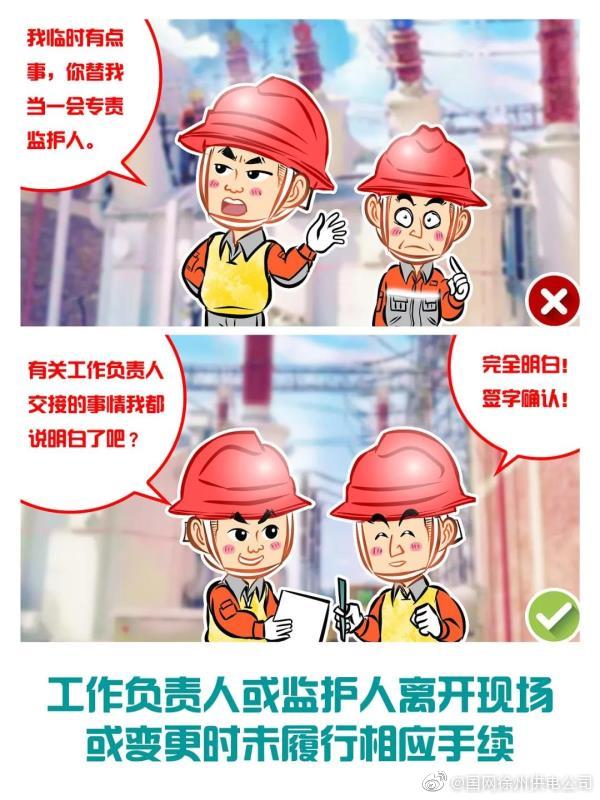 【電力施工安全反違章——工作負(fù)責(zé)人、專責(zé)監(jiān)護(hù)人離開工作現(xiàn)場(chǎng)或變更時(shí)未履行相應(yīng)手續(xù)】專責(zé)監(jiān)護(hù)人需長時(shí)間離開工作現(xiàn)場(chǎng)時(shí),應(yīng)由工作負(fù)責(zé)人變更專責(zé)監(jiān)護(hù)人,履行變更手續(xù),并告知全體被監(jiān)護(hù)人員。工作期間,工作負(fù)責(zé)人若需暫時(shí)離開工作現(xiàn)場(chǎng),應(yīng)指定能勝任的人員臨時(shí)代替,離開前應(yīng)將工作現(xiàn)場(chǎng)交待清楚,并告知全體工作班成員。原工作負(fù)責(zé)人返回工作現(xiàn)場(chǎng)時(shí),也應(yīng)履行同樣的交接手續(xù)。工作負(fù)責(zé)人若需長時(shí)間離開工作現(xiàn)場(chǎng)時(shí),應(yīng)由原工作票簽發(fā)人變更工作負(fù)責(zé)人,履行變更手續(xù),并告知全體工作班成員及所有工作許可人。原、現(xiàn)工作負(fù)責(zé)人應(yīng)履行必要的交接手續(xù),并在工作票上簽名確認(rèn)。