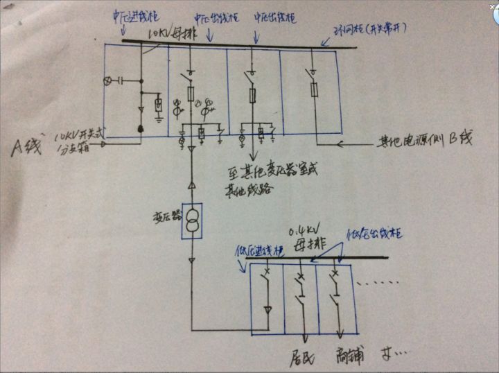平時,電從A線電源處來,經(jīng)過中壓進線柜,由各個中壓出線柜分配給各個變壓器。變壓器通過電壓轉(zhuǎn)換,電由低壓進線柜進入后,同理由各個低壓出線柜分配到各家各戶里。