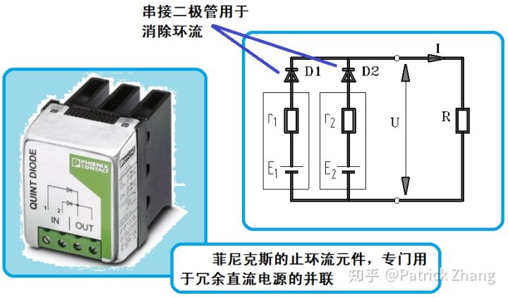 在實(shí)用中,為了避免環(huán)流,兩只電壓源并聯(lián)時(shí)必須在正極串聯(lián)二極管來消除環(huán)流。見下圖: