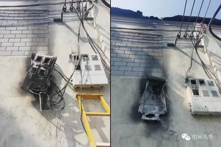 司小孬掛斷電話,穿衣,拎工具包,開著自家車,5分鐘后趕到了現(xiàn)場。此時,不少驚慌失措的村民已經(jīng)聚在邊上。表箱著火,火焰竄出3米多高,鋁導(dǎo)線短路熔化,金屬熔液流到草上、墻上,一家住戶的塑料瓦房檐也已被燙化。