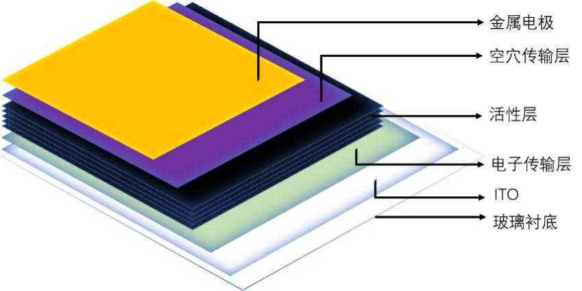 器件結(jié)構(gòu)形似三明治,具有光電效應(yīng)的活性層被電子傳輸層和空穴(電子躍遷后形成的局部缺電子部分稱為空穴)傳輸層夾在中間,兩端為電極材料,一般是金屬和氧化銦錫(ITO)。