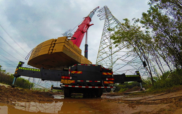 A42號鐵塔高85米,重116噸,停電后才能組立。為提高功效,項目部調用200噸吊車組立?,F場泥濘濕陷,吊車進不去,項目部又用水泵抽水,用60多塊鋼板鋪路,給吊車創(chuàng)造條件。