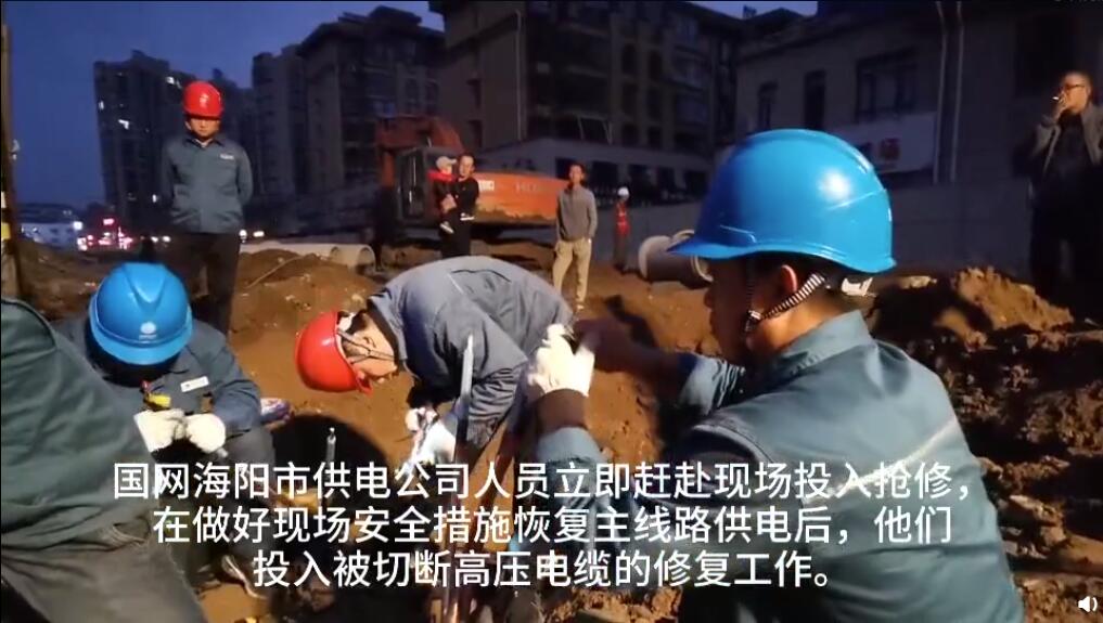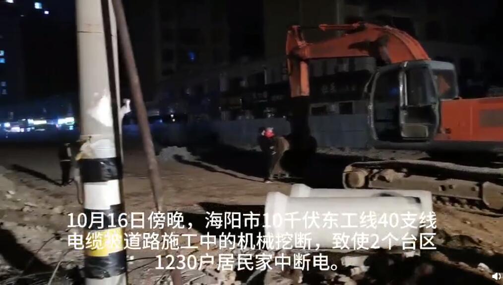 10月16日傍晚,海陽市10千伏東工線40支線電纜被道路施工機(jī)械挖斷,導(dǎo)致兩個(gè)臺(tái)區(qū)居民電力中斷。國網(wǎng)海陽供電公司員工迅速趕赴現(xiàn)場恢復(fù)主線路供電后,全力投入搶修工作。經(jīng)過一個(gè)半小時(shí)的緊張施工,線路搶修完畢,于18時(shí)20分恢復(fù)電力供應(yīng)。
