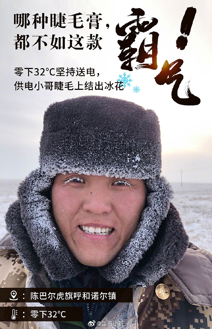 【哪種睫毛膏,都不如這款霸氣!】冬季,蒙東陳巴爾虎旗呼和諾爾鎮(zhèn)氣溫極低,是防寒保暖用電高峰。2019年12月29日,室外零下32攝氏度,寒風凜冽,為了能給牧民及時送上電,供電員工爬上被積雪覆蓋的電桿,一干就是兩個小時。從電桿上下來時,供電小哥的帽子、眉毛上都結(jié)了冰花。向寒冬中的工作者致敬,你們辛苦了!