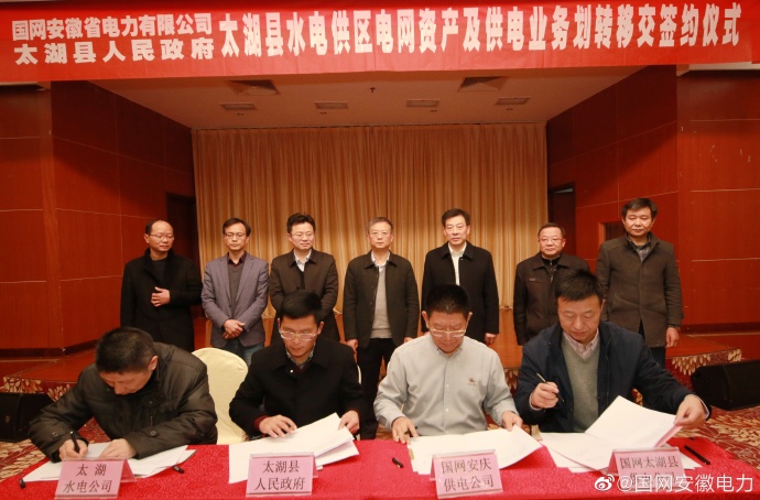 1月3日下午,國網(wǎng)安徽省電力有限公司與太湖縣人民政府就全縣水電供區(qū)電網(wǎng)資產(chǎn)及供電業(yè)務(wù)劃轉(zhuǎn)移交舉行簽約儀式,標(biāo)志著全省6個原水電供區(qū)電網(wǎng)資產(chǎn)已全部正式移交國網(wǎng)安徽電力。太湖縣委副書記、縣長朱小兵,副縣長彭林,國網(wǎng)安徽省電力有限公司副總工程師、安全總監(jiān)洪天炘,國網(wǎng)安慶供電公司主要負(fù)責(zé)同志、太湖縣政府和太湖縣水電公司有關(guān)負(fù)責(zé)人出席簽約儀式。