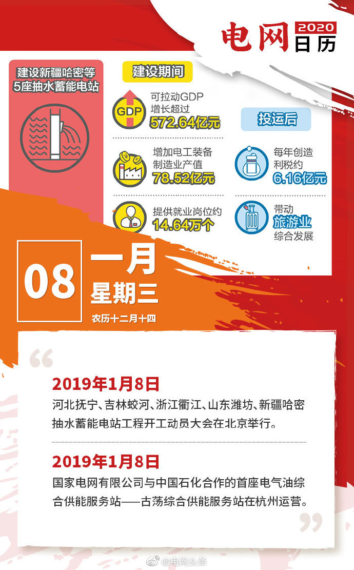 2019年1月8日,河北撫寧、吉林蛟河、浙江衢江、山東濰坊、新疆哈密抽水蓄能電站工程開工動員大會在北京舉行。2019年1月8日,國家電網(wǎng)有限公司與中國石化合作的首座電氣油綜合供能服務(wù)站——古蕩綜合供能服務(wù)站在杭州運(yùn)營。 ????