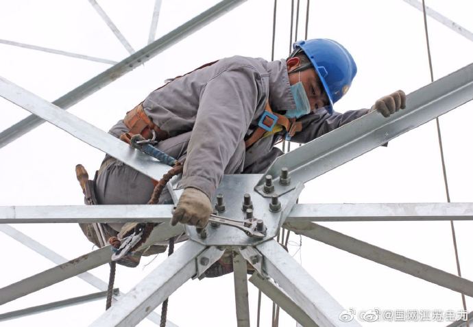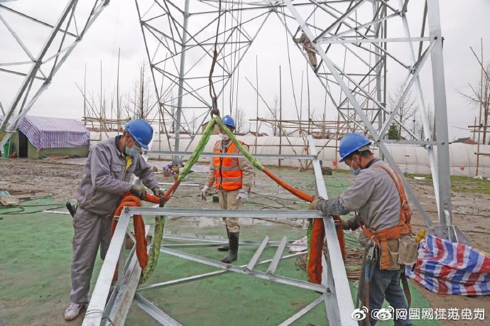 【復(fù)工加快鹽通高鐵安豐牽引站線路施工】3月28日,江蘇省送變電公司電力施工人員冒著小雨,在東臺(tái)市南沈灶鎮(zhèn)萬橋村境內(nèi)突出組裝鹽通高鐵安豐牽引站外部供電工程220千伏金安線32號(hào)鐵塔,現(xiàn)場(chǎng)安全監(jiān)管人員加強(qiáng)防疫、安全管控,確保按期完成施工任務(wù),保障鹽通高鐵按期調(diào)試,順利投運(yùn)。