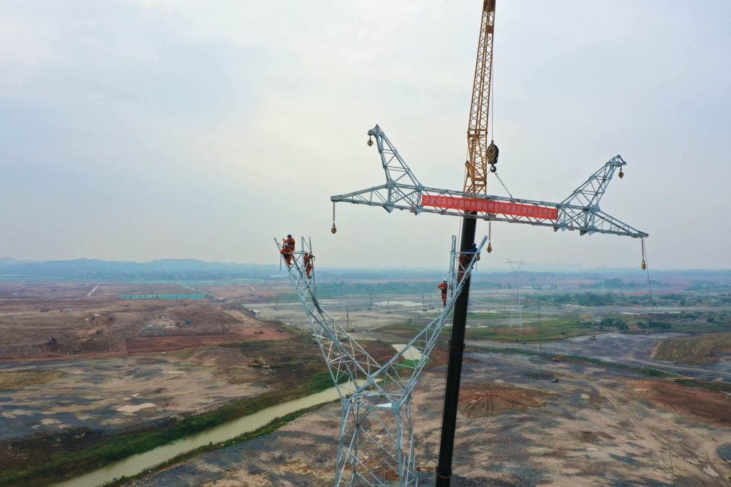 5月5日下午5點,湖北鄂州機場核心區(qū)內(nèi),湖北鄂州供電公司電網(wǎng)建設(shè)人員進行110千伏燕楊線遷改施工作業(yè),順利完成這基最高鐵塔吊裝。