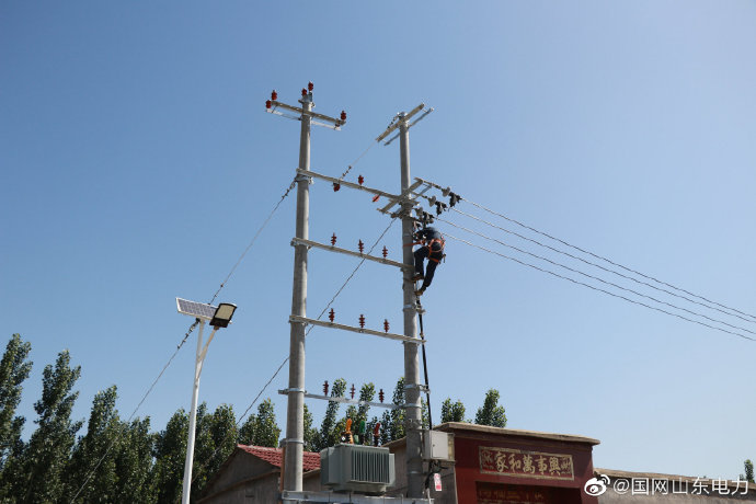 【加快農(nóng)網(wǎng)改造 助力脫貧攻堅(jiān)】5月19日,國網(wǎng)東阿縣供電公司施工人員對(duì)牛屯村線路進(jìn)行農(nóng)網(wǎng)施工改造,改造低壓線路1000米,架設(shè)絕緣導(dǎo)線1500米,立桿3基,提升電網(wǎng)供電穩(wěn)定性,為居民脫貧提供電力保障。 ????