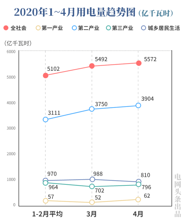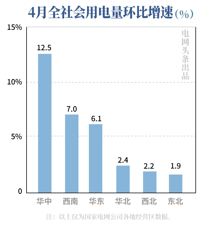 4月份,在國家電網(wǎng)經(jīng)營區(qū),華東、華北、東北區(qū)域全社會用電量已與去年同期基本持平;西南、西北、華中區(qū)域全社會用電量已超過去年同期水平,增速分別為3.9%、2.6%、1.3%。