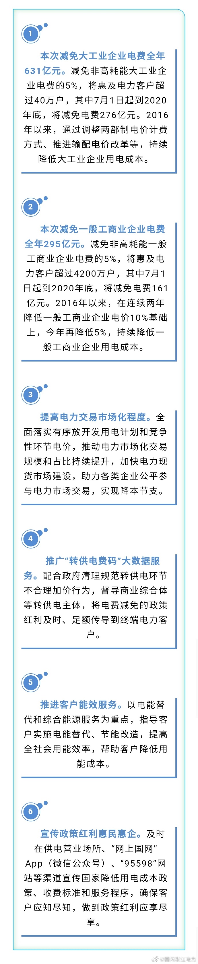 5月22日,第十三屆全國(guó)人民代表大會(huì)第三次會(huì)議在京開(kāi)幕,國(guó)務(wù)院總理李克強(qiáng)作政府工作報(bào)告,報(bào)告指出,“推動(dòng)降低企業(yè)生產(chǎn)經(jīng)營(yíng)成本。降低工商業(yè)電價(jià)5%政策延長(zhǎng)到今年年底”。國(guó)家電網(wǎng)公司黨組堅(jiān)決貫徹落實(shí)黨中央、國(guó)務(wù)院決策部署,堅(jiān)決執(zhí)行降低用電成本政策,確保政策紅利不折不扣落實(shí)到每一個(gè)電力客戶,并按照國(guó)家發(fā)改委報(bào)告中提出的“將除高耗能以外的大工業(yè)和一般工商業(yè)電價(jià)降低5%政策延長(zhǎng)到今年年底”的要求,預(yù)計(jì)全年減免電費(fèi)約926億元。