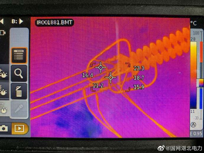 拍一張照,導線燒不燒全知道。6月18日,國網(wǎng)湖北檢修公司鄂西北運維分部職工對500千伏斗樊二回線開展耐張接點紅外測溫工作。打開紅外測溫儀,輕輕一點,導線溫度、接點溫度全記錄,及時發(fā)現(xiàn)發(fā)熱缺陷并處理,讓設(shè)備以最優(yōu)的狀態(tài)迎峰度夏。