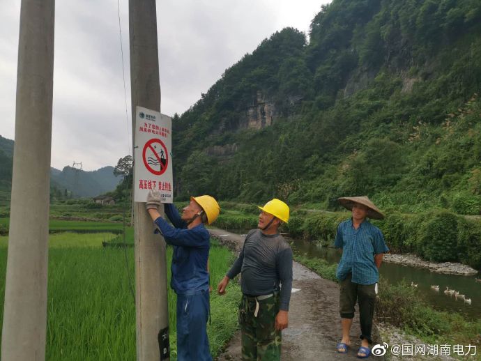 7月19日,國網(wǎng)鳳凰縣供電公司員工楊長青等人在竿子坪鎮(zhèn)洞腳村魚塘附近安裝“高壓危險,禁止釣魚”標(biāo)示牌。(滕新春) ????