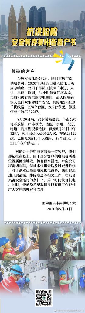 重慶市南供電公司《抗洪搶險 安全有序復(fù)電告客戶書》