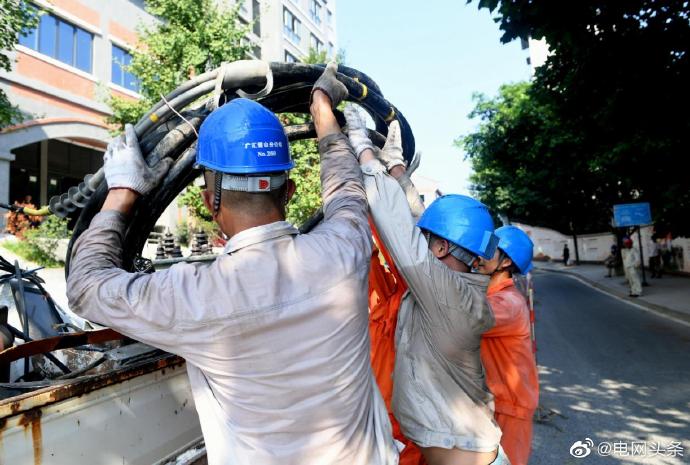 8月4日8時,烈日高照,重慶璧山區(qū)來鳳街道河壩街地表溫度高達45攝氏度。在10千伏四鹿線鹿來支線15-1號電桿,重慶璧山供電公司10余名員工冒高溫,將一臺250千伏安變壓器、兩根電桿、100余米高低壓電纜、配電箱等設(shè)施拆除。 ????