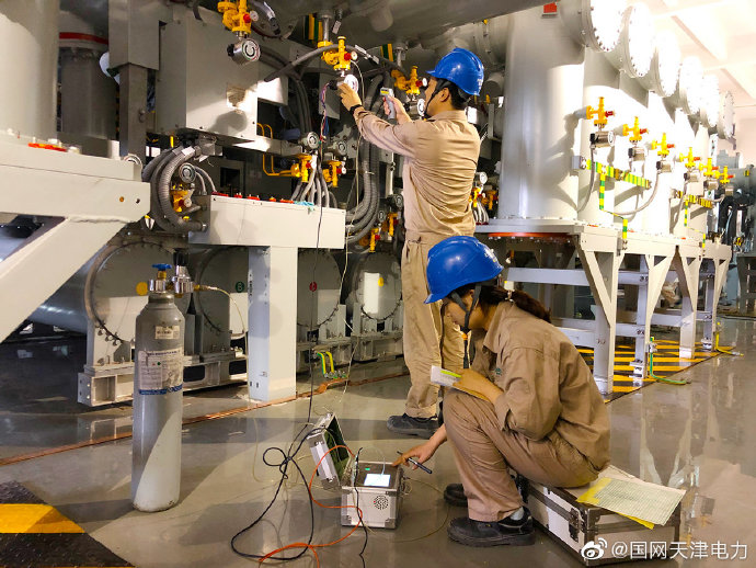 6月13日,天津送變電員工王德新、范明怡在交流220千伏學(xué)府路變電站220千伏設(shè)備區(qū)校驗(yàn)SF6密度繼電器 ????.