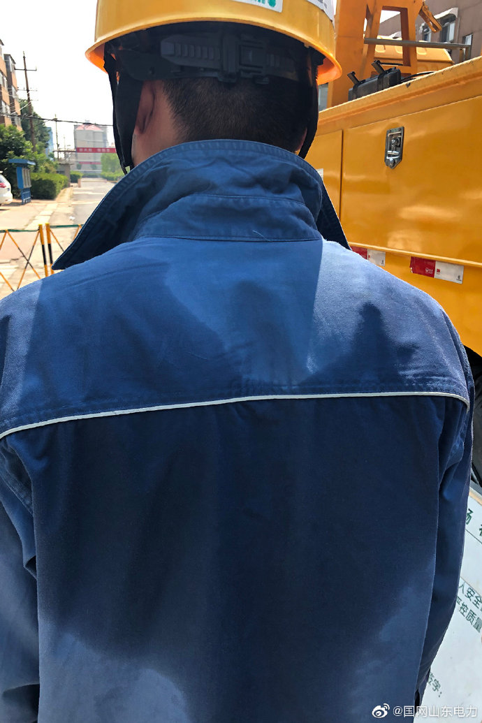 6月24日,氣溫34攝氏度,國網(wǎng)濱州供電公司帶電作業(yè)人員在10千伏渤五線雙峰石墨支線1號桿為某小區(qū)帶電接火。帶電作業(yè)人員在半空中工作近1小時才完成工作,當(dāng)他們返回地面,脫下絕緣屏蔽服,汗水在他們的工裝上留下了一個“愛心”圖案。