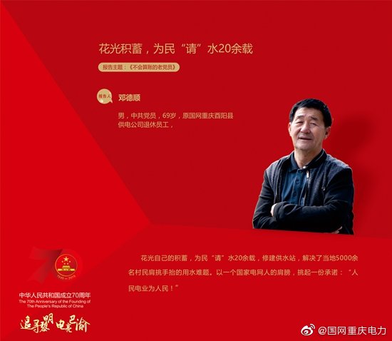 36年前,鄧德順成為酉陽縣供電公司的一名駕駛員,勤勞能干,業(yè)余時(shí)間去打鐵、理發(fā)、跑運(yùn)輸,很快就攢下一筆存款,如果故事就這樣發(fā)展下去,鄧德順現(xiàn)在的生活會(huì)是富足又安逸的。但在1997年春節(jié),一塊兒長大的村民石邦祿挑水摔折了腿,讓鄧德順惦記起還吃不起自來水的鄉(xiāng)親們,他認(rèn)識(shí)到如果說自己這些年都是在被別人幫助,在積蓄能量,那這時(shí)也到了自己發(fā)光發(fā)熱,去幫助別人的時(shí)候了。說干就干,鄧德順立馬就張羅著買管道修水站,下定決心要解決家鄉(xiāng)吃水難問題。這一干,就是二十多年,鄧德順投進(jìn)去了400萬,光是管道就換了三次,從小管到大管,從易腐蝕的鐵管到夠堅(jiān)固的膠管……從小有積蓄到賣掉房子還欠下外債,這筆賬鄧德順都不想算。如今,水站運(yùn)作上了軌道, 4000多人的吃水問題解決了。老黨員鄧德順還是不算賬。水費(fèi)按戶收,一年只收120,孤寡老人、貧困戶、退伍軍人家庭水費(fèi)全免,而每年光維修維護(hù)費(fèi)用就得一萬多, 所以2010年退休后鄧德順就干脆搬回村里來自己搞維護(hù)。鄧德順總覺得,這就是自己作為一個(gè)老黨員責(zé)無旁貸的使命,覺得這件事就應(yīng)該由自己擔(dān)當(dāng)起來。如今,他還在盤算著招商引資讓家鄉(xiāng)甘甜的純凈水成為產(chǎn)品,走出高莊村,給村民們帶來更多的就業(yè)機(jī)會(huì)和經(jīng)濟(jì)收入。從自發(fā)到自覺,從受助到助人,從蓄電到發(fā)電,談起這些年的付出,鄧德順的話很樸實(shí):這就是一個(gè)共產(chǎn)黨員應(yīng)該做的。