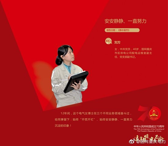 劉方,電力專業(yè)女博士,國網(wǎng)重慶市區(qū)供電公司配電運(yùn)檢室主持工作的副主任和主持黨務(wù)工作的黨支部副書記——重慶市“五一勞動(dòng)獎(jiǎng)?wù)隆鲍@得者,國家電網(wǎng)公司勞動(dòng)模范、劉方勞模工作室領(lǐng)軍人物。從調(diào)控中心到運(yùn)維檢修部、發(fā)展策劃部,到再回配電運(yùn)檢室。12年間,劉方在三個(gè)不同業(yè)務(wù)領(lǐng)域奮斗過,她帶領(lǐng)團(tuán)隊(duì)在三個(gè)月內(nèi)完成了總計(jì)60多個(gè)變電站的整合調(diào)試,參與推動(dòng)了來福士廣場(chǎng)的朝天門變電站聯(lián)建實(shí)現(xiàn)政府、企業(yè)、居民的三贏,在工作中她給同事留下始終“不慌不忙”、始終安安靜靜、一直努力沉淀的印象。因?yàn)閷I(yè),所以專注;因?yàn)閷W?,所以安靜,芳華自開。