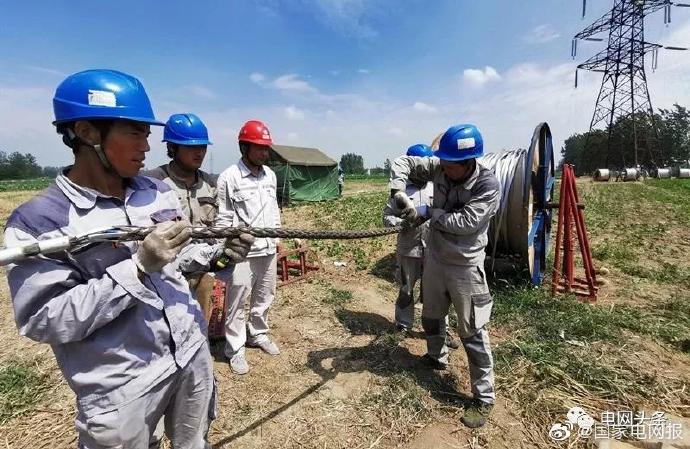 5.7月9日,安徽阜陽供電公司員工在聞集鎮(zhèn)境內(nèi)500千伏沙河變電站至220千伏東莊變電站線路10號塔處放線。