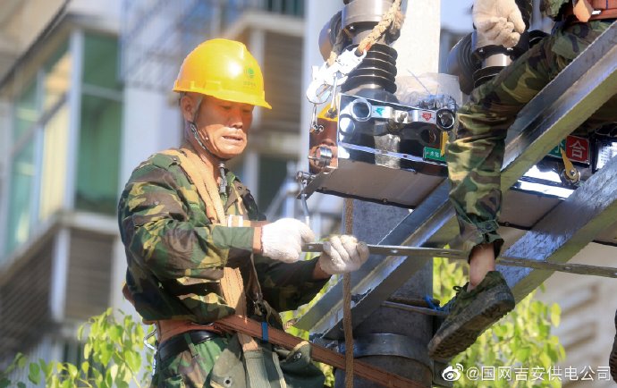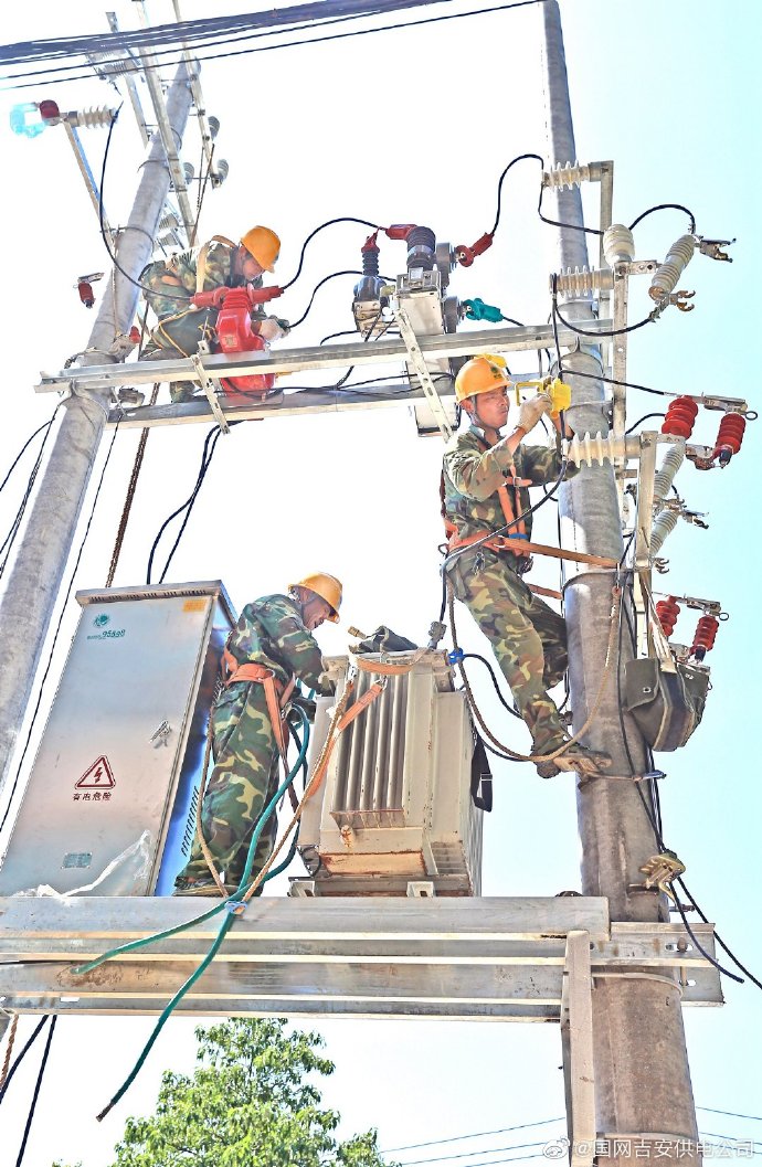 【酷暑日為客戶安裝專變臺(tái)區(qū)】7月24日,國(guó)網(wǎng)吉安供電公司員工在永豐縣恩江鎮(zhèn)聶家橋頭對(duì)憶鄉(xiāng)賓館專變臺(tái)區(qū)工程施工。