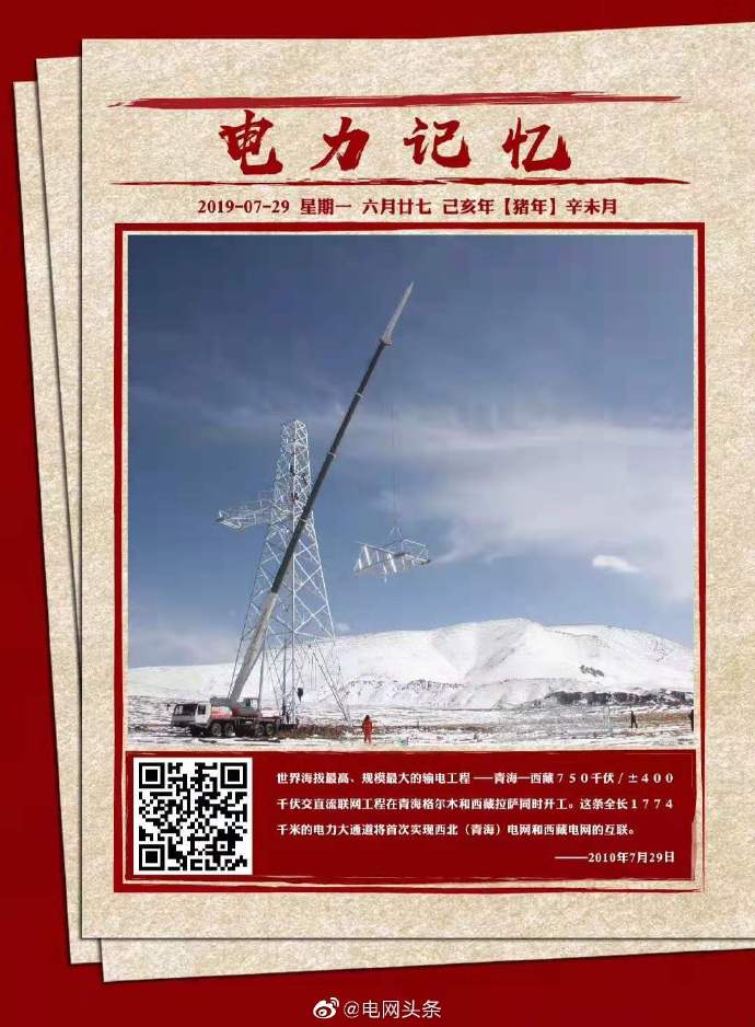 2010年7月29日,世界海拔最高、規(guī)模最大的輸電工程——青?!鞑?50千伏/±400千伏交直流聯(lián)網(wǎng)工程在青海格爾木和西藏拉薩同時開工。這條全長1774千米的電力大通道首次實現(xiàn)了西北(青海)電網(wǎng)和西藏電網(wǎng)的互聯(lián)。