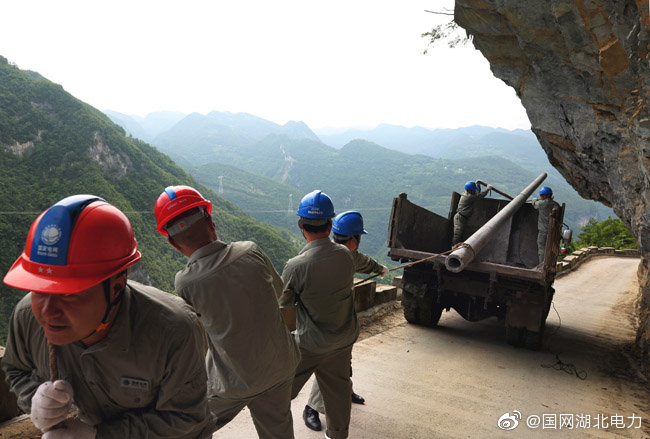 【電線桿過(guò)“關(guān)”記】8月1日,國(guó)網(wǎng)建始縣供電公司龍坪供電所員工在龍坪鄉(xiāng)野果寨村轉(zhuǎn)運(yùn)網(wǎng)改物資材料。建始縣龍坪鄉(xiāng)野果寨村一處公路有近500米路段是在絕壁上開(kāi)鑿而成,公路上方突兀伸出的絕壁與路面垂直距離僅3米左右,農(nóng)用車(chē)?yán)?米長(zhǎng)水泥電桿無(wú)法通過(guò),工人們只好徒手將電桿卸下,再用人力推車(chē)轉(zhuǎn)運(yùn)到作業(yè)點(diǎn)。