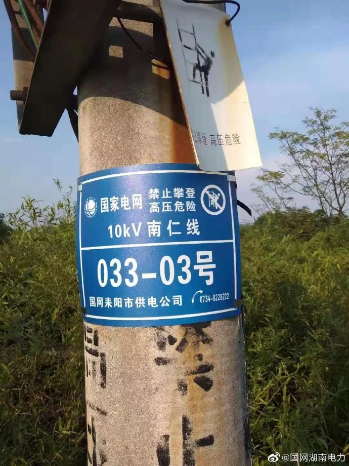 耒陽供電公司對(duì)10千伏南集線綁扎號(hào)桿牌懸掛安全警示牌