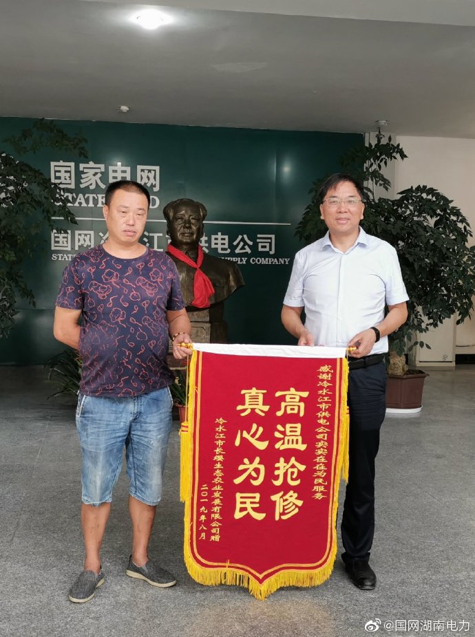 8月19日,國(guó)網(wǎng)冷水江市供電公司鐸山供電所工作人員頂著炎炎烈日對(duì)王家村的停電故障快速搶修恢復(fù)送電,群眾的生產(chǎn)、生活用電均得到保障,客戶(hù)自發(fā)送來(lái)“高溫?fù)屝?真心為民”的錦旗表示感謝。