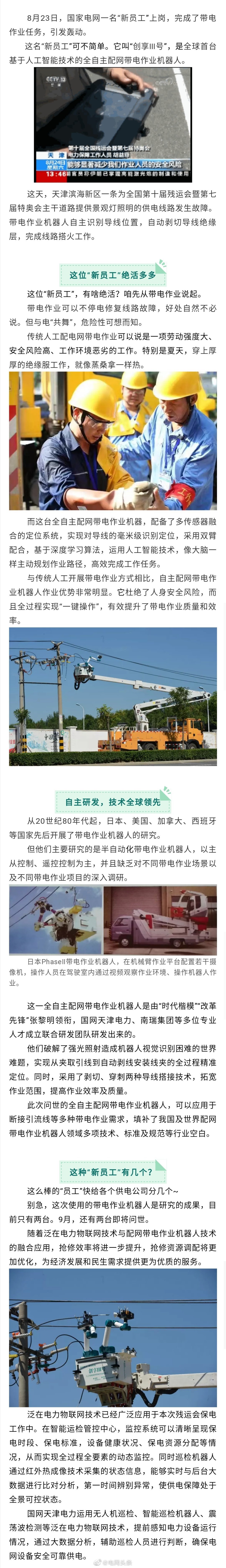 國(guó)家電網(wǎng)特殊“新員工”上崗】8月23日,國(guó)家電網(wǎng)一名“新員工”上崗,完成了帶電作業(yè)任務(wù),引發(fā)轟動(dòng)。這名“新員工”可不簡(jiǎn)單。它叫“創(chuàng)享Ⅲ號(hào)”,是全球首臺(tái)基于人工智能技術(shù)的全自主配網(wǎng)帶電作業(yè)機(jī)器人。這位“新員工”絕活多多,一起來看