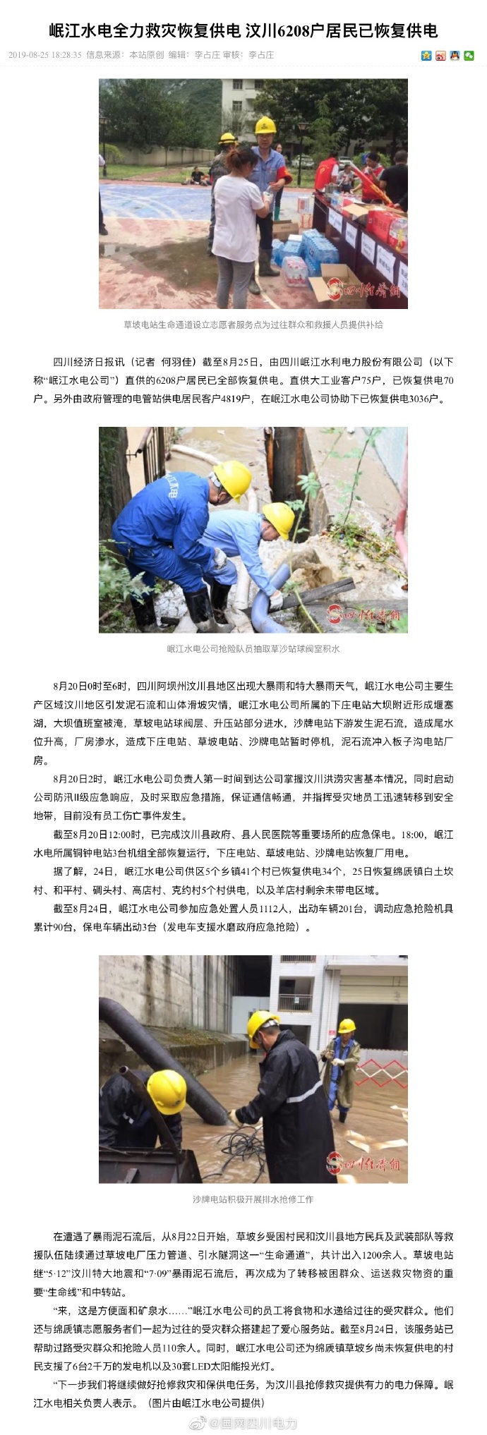發(fā)布時(shí)間:2019/08/26 行業(yè)新聞 標(biāo)簽:四川岷江水利電力股份有限公司救災(zāi)恢復(fù)供電瀏覽次數(shù):2279