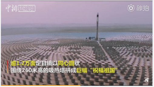 【震撼!戈壁灘上1.2萬面定日鏡拼出巨幅祝福祖國】近日,甘肅敦煌100兆瓦熔鹽塔式光熱發(fā)電站場區(qū)內(nèi),逾1.2萬面定日鏡,以同心圓狀圍繞260米高的吸熱塔,拼成巨幅“祝福祖國”!據(jù)悉,這是全球聚光規(guī)模最大、可24小時連續(xù)發(fā)電的100兆瓦級熔鹽塔式光熱電站。網(wǎng)友:祝福我的祖國,為阿中哥打CALL!