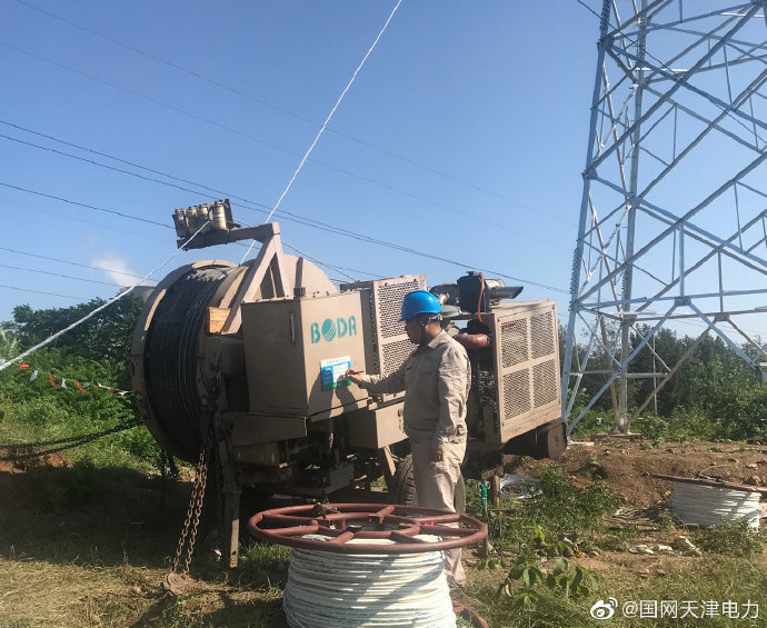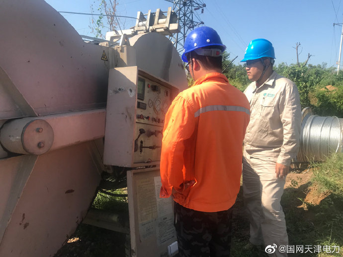 8月26日,送變電公司員工陳津濤在薊州徐各莊35kV變電站擴工程(架空部分)檢查張力機狀態(tài)。 ????