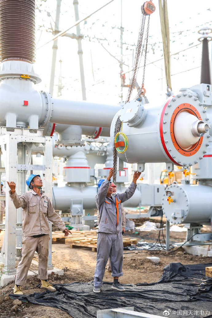 8月29日,天津送變電公司員工李斌等在500千伏天津?qū)氎媲栕冸娬景惭b500千伏HGIS電壓互感器。 ????