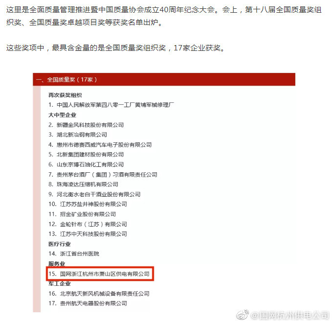 【國家級榮譽,這家縣級供電公司怎么拿到的?】高質(zhì)量不是一朝就能“煉”成的,自2010年國網(wǎng)杭州市蕭山區(qū)供電公司導入卓越績效模式,實施高質(zhì)量發(fā)展戰(zhàn)略以來,9年的艱苦卓絕的努力,獲得了國家的認可,獲得了客戶的認可,獲得了未來高質(zhì)量發(fā)展的無限可能。