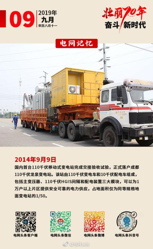 2014年9月9日,國內(nèi)首臺110千伏移動式變電站完成交接驗收試驗,正式落戶成都110千伏龍泉變電站。該站由110千伏變電車和10千伏配電車組成,包括主變壓器、110千伏HGIS間隔和配電裝置三大模塊,可以為1萬戶以上片區(qū)提供安全可靠的電力供應,占地面積僅為同等規(guī)格地面變電站的1/50。