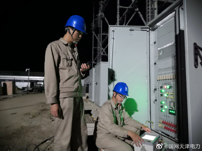 9月9日,天津送變電公司員工吳愷、殷煒榕在交流500千伏渠陽(寶北)變電站調(diào)試220千伏線路保護裝置。 ????