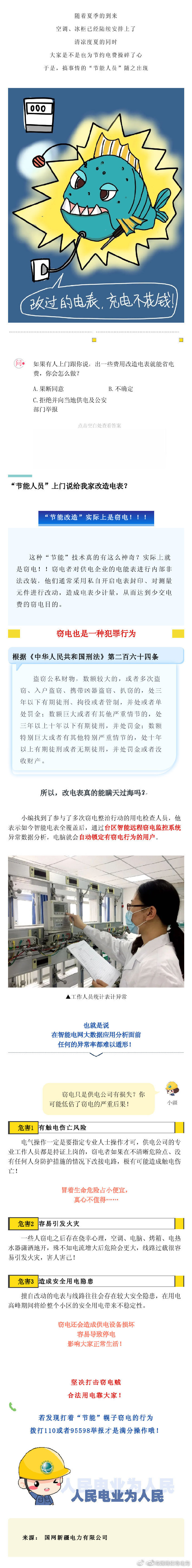 隨著夏季的到來,空調(diào)、冰柜已經(jīng)陸續(xù)安排上了,清涼度夏的同時(shí),大家是不是也為節(jié)約電費(fèi)操碎了心,于是,搞事情的“節(jié)能人員”隨之出現(xiàn)?!肮?jié)能人員”上門說給你家改造電表?這種“節(jié)能”技術(shù)真的有這么神奇?實(shí)際上就是竊電??! ????