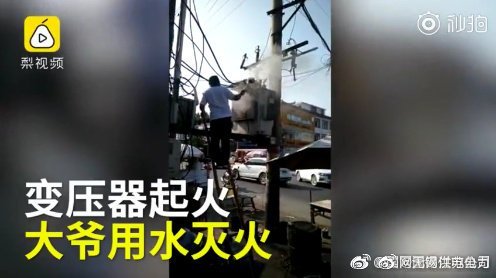 日前,某縣市一變壓器著火,大爺爬梯子用鐵瓢舀水往火上澆。大爺說,他家離這近,怕火大了跟著燒起來。這種做法太危險!??!萬一遇到類似情況,請立即撥打國網(wǎng)供電公司客服電話95598,并立即報警! ????