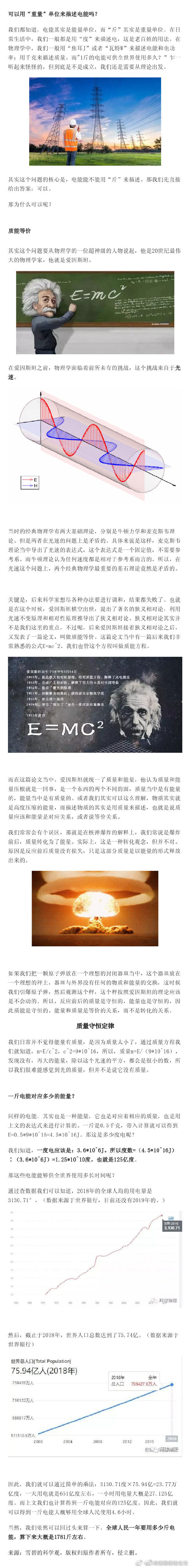 電能其實(shí)是能量單位,“斤”是重量單位。在日常生活中,我們一般都是用“度”來描述電,這是老百姓的用法。在物理學(xué)中,我們一般用“焦耳J”或者“瓦特W”來描述電能和電功率;用千克來描述質(zhì)量。而”1斤的電能可供全世界使用多久?” ????
