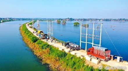 8月18日,在廬江縣同大鎮(zhèn)白石天河古圩段圩堤上,國(guó)網(wǎng)廬江縣供電公司黨員突擊隊(duì)正在進(jìn)行立桿、架線、安裝配變?cè)O(shè)備,為石大圩、牛廣圩排水提供電力保障。