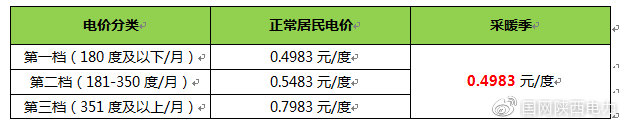 取消階梯優(yōu)惠:在采暖期(當(dāng)年11月1日至次年3月31日)內(nèi)用戶的執(zhí)行電價(jià)由階梯電價(jià)升級(jí)為僅執(zhí)行居民階梯第一檔優(yōu)惠電價(jià)0.4983元/度。